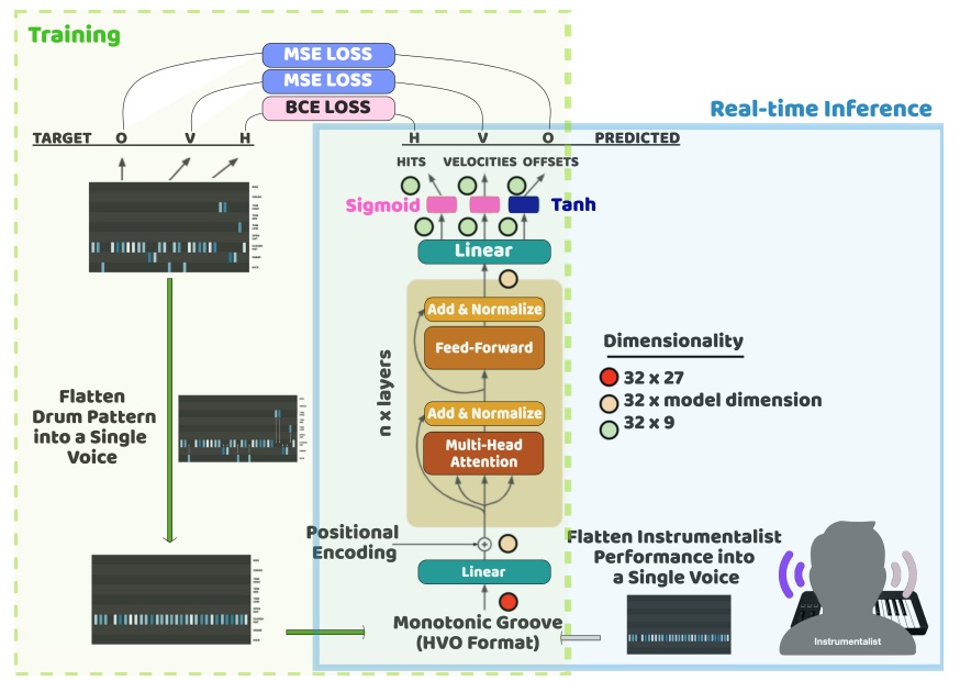 - These systems are then paired with the GrooveTransformer system to generate drum loops that are interlocked with the input performance.